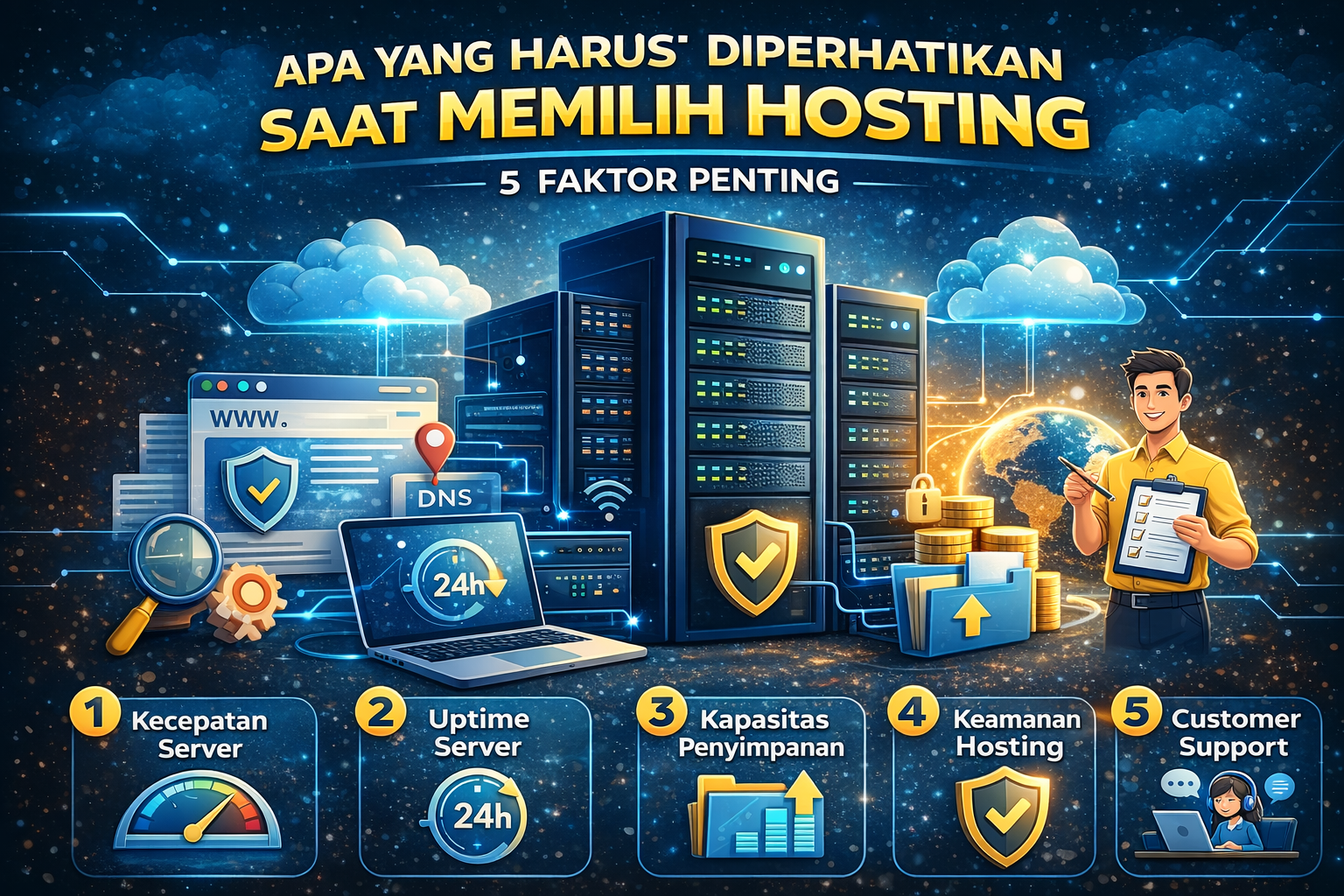 Memilih hosting yang tepat sangat berpengaruh terhadap performa dan keamanan website. Beberapa faktor penting yang perlu diperhatikan antara lain kecepatan server, uptime, kapasitas penyimpanan, keamanan, layanan customer support, serta harga hosting.